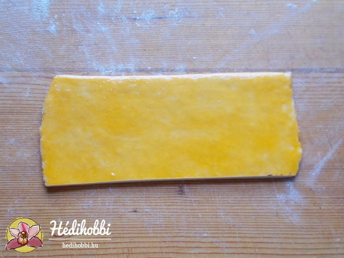 Ha kifagyott a tészta, vágjuk különböző formájúra, pl. téglalap, kocka, rombusz, stb. Szerintem akkor szép, ha a különböző tetejűek más-más formájúak. A végeket vagy a csúnyább darabokat tegyük félre, majd a végén begyúrjuk és kiszaggatjuk. Egyszerre csak az egyik tepsit vegyük ki a hűtőből, nehogy közben felmelegedjen a másik és ne tudjunk vele dolgozni.